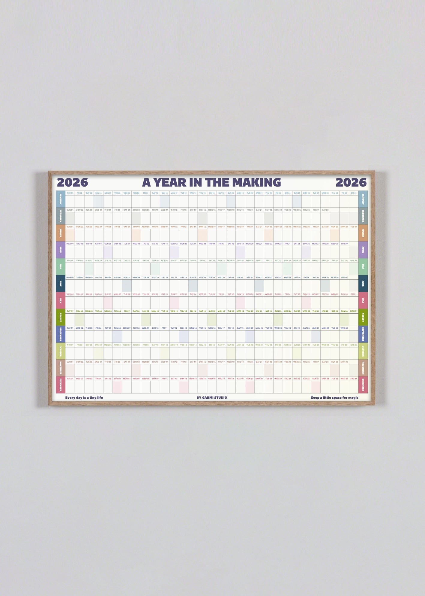 A modern wall calendar in soft pastel tones and a tidy table layout. Designed to bring calm to your chaos. Perfect for those who love order — or need a gentle reminder of it every day.